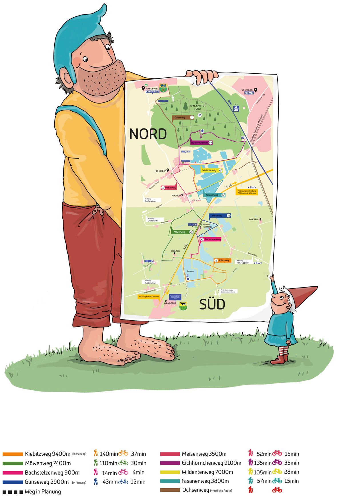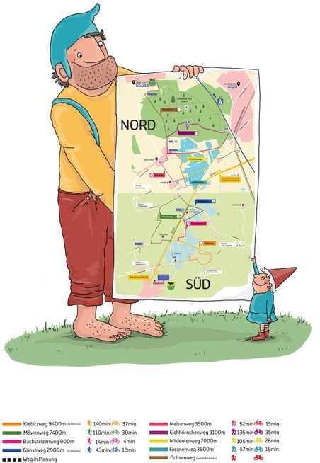 Alle Wanderwege haben eine eigene Farbkennzeichnung, die man auf Hinweisschilder, Pfeilschilder und Infotafeln wiederfindet. Die Infotafeln sind bewusst in einer geeigneten Höhe zum Lesen und Anschauen für Kinder angebracht, dort finden sich auch Die Sympathiefiguren Hawi der Riese und Waru der Wichtel aus den Kinderheften der beiden Sympathiefiguren wieder.