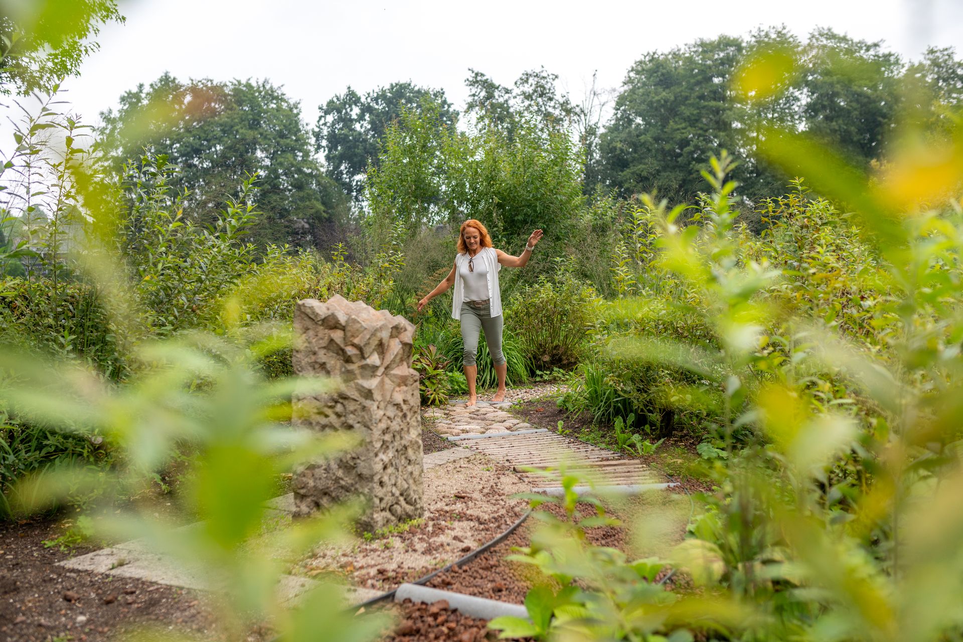 Der Garten des Tastens lädt dich mit einem abwechslungsreichen Barfußpfad ein, unterschiedliche Bodenbeläge zu spüren und deine Sinne zu schärfen. Ruhe und Kraft findest du im Garten zum Lebensrhythmus, bevor du im Garten des Wassers entspannst und neue Energie tankst.