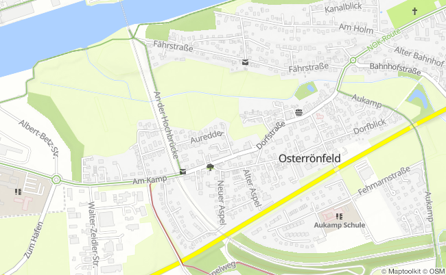 Osterrönfeld befindet sich in der geografischen Mitte von Schleswig-Holstein und liegt direkt am Nord-Ostsee-Kanal (NOK). Auf der gegenüberliegenden Seite des Kanals erreichen Sie schnell die Kreisstadt Rendsburg. Dank der Tunnelverbindungen, sowohl für Autos als auch für Fußgänger, sind Sie in kürzester Zeit in der Innenstadt.