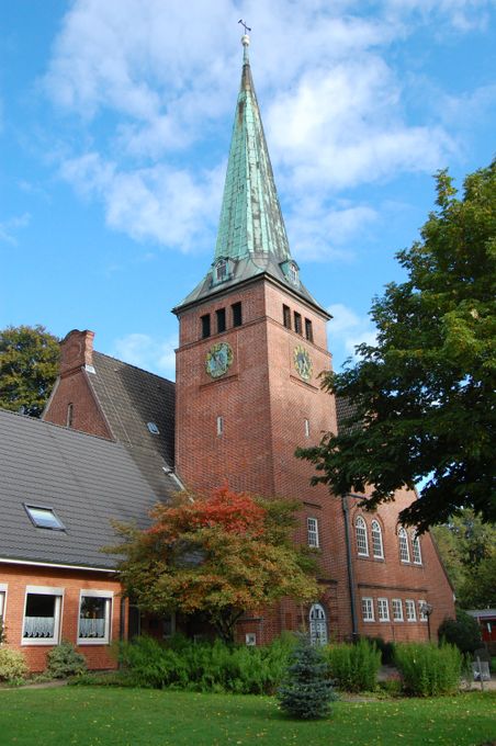 Die Pläne der Kirche hat der Kieler Architekt Johann Theede entworfen, der mit der leitenden Person des Itzehoer Baurats Strümpfler und dem Regierungsbauführer Zimmermann kooperiert hat. Ab dem Jahr 1911 wurde die Kirche errichtet und ein Jahr eingeweiht. Zunächst war sie eine Filialkirche von Münsterdorf, ist aber seit gut 50 Jahren eine eigenständige Kirchengemeinde im evangelisch-lutherischen Kirchenkreis Rantzau-Münsterdorf.
